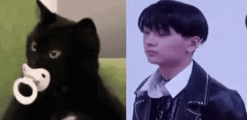 Jay from ENHYPEN is shown alongside a black cat with a pacifier, creating a popular meme.