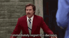 Ron Burgundy (Will Ferrell) expresses immediate regret, saying 'I immediately regret this decision.'