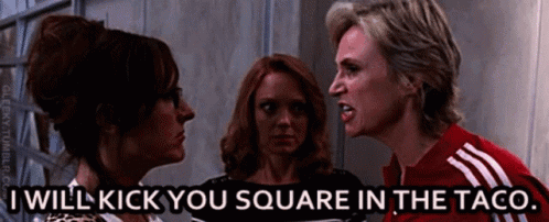 Jay69design features three women, one threatening, 'I'll kick you square in the taco.'