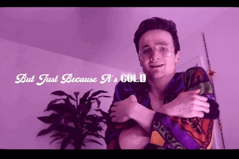 Jazz Emu in a colorful shirt, hugging himself with the text 'But Just Because It's Cold' overlaid.