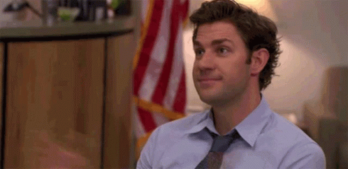 Jim Halpert from The Office performs his iconic jazz hands gesture with a smirk.