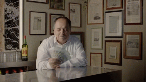 Man at a bar happily fanning himself with 6000 pesetas, with a JB bottle in the background, referencing Torrente.