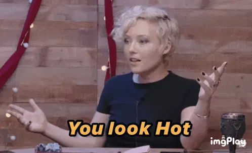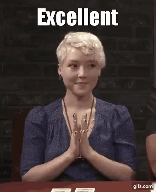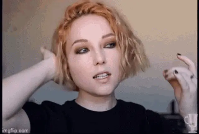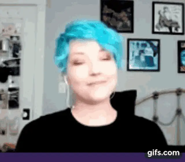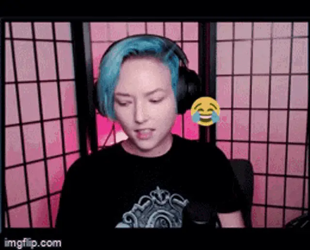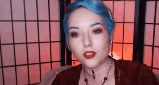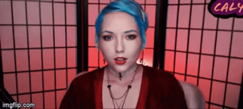 Josephine Mcadam reacts with 'Oh mon Dieu' while looking distressed, with blue hair and a red background.