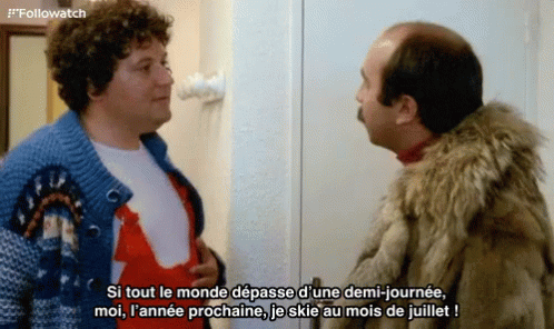 A man in a fur coat declares, 'If everyone goes over by half a day, next year, I'll be skiing in July!'