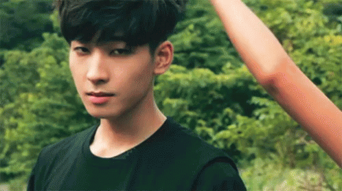 Handsome young man in a black t-shirt standing confidently in front of a lush forest.