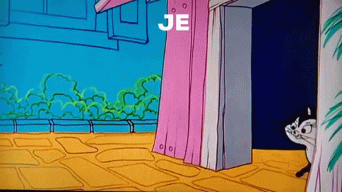 Penelope Pussycat peeks from behind a pink curtain, with the French phrase 'Je Suis Prete' displayed on screen.