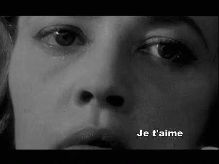 Jeanne Moreau's intense gaze in a classic black and white scene, with the French phrase 'Je t'aime' displayed.