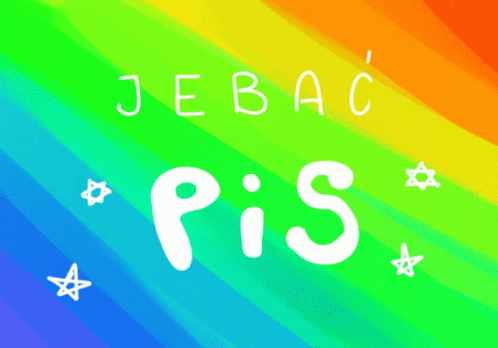 The phrase 'Jebać PiS' displayed prominently on a vibrant rainbow background, symbolizing protest and LGBTQ+ support.