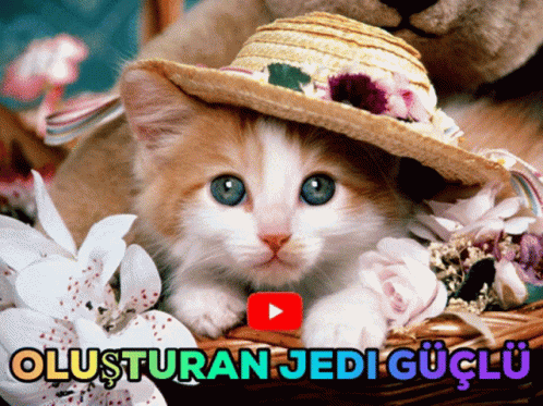 An adorable kitten wearing a straw hat, nestled in a basket adorned with flowers, looking directly at the camera.