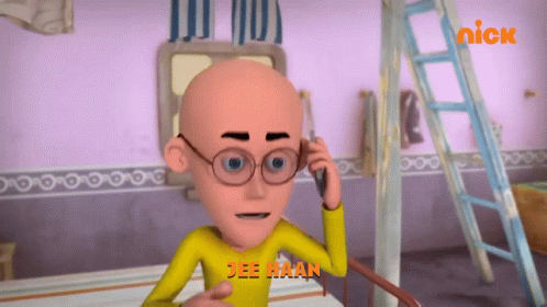 Patlu from Motu Patlu talks on the phone, saying "Jee Haan" with a concerned expression.