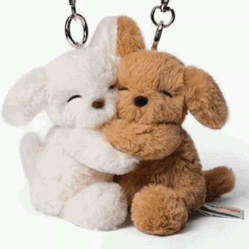Jegulitos and Juantin share a warm embrace, followed by cute plush dog keychains hugging.