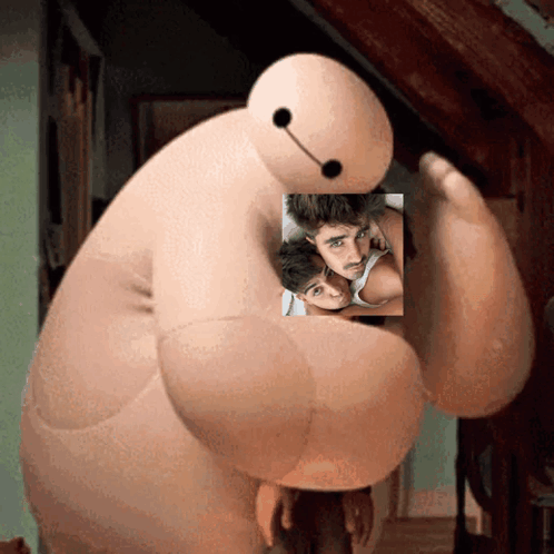Baymax, the inflatable robot, holds a picture of Jegulitos Jegulitos Juantin on his chest.