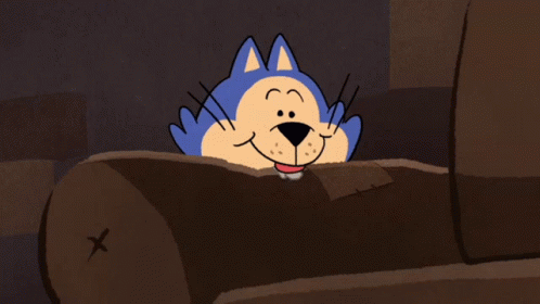 Benny The Ball, the cartoon cat from Hanna Barbera's Jellystone, peeks over a brown object, licking his lips.