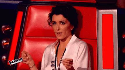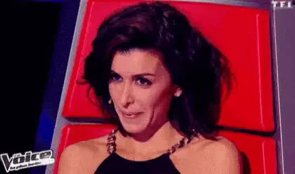 Jenifer Bartoli, a coach on The Voice France, sits in a red chair, engaged in conversation.