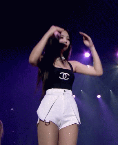 Jennie Kim performing on stage, wearing a black Chanel top and white shorts, holding a pink microphone.