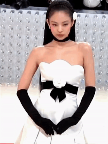 Jennie Kim stuns in a white dress and black gloves at the Met Gala 2023 red carpet.