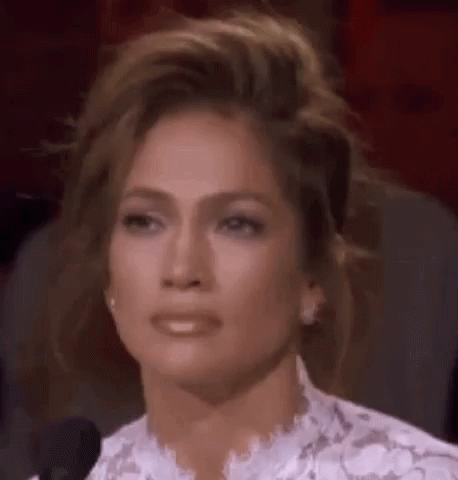 Jennifer Lopez makes a definitive 'no' expression, shaking her head slightly while wearing a white lace top.