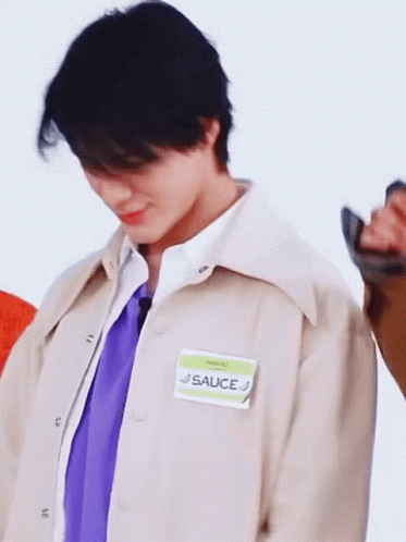 NCT's Jeno Lee strikes a dramatic 'dead' pose, wearing a jacket with a 'SAUCE' name tag, with '#dead' caption.