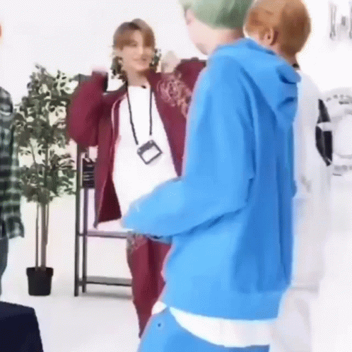 Jeno from NCT Dream is seen happily dancing and celebrating in a bright room with other group members.