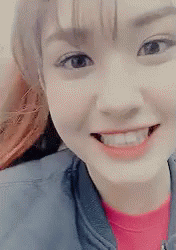 Jeon Somi of IOI shares a bright, close-up smile, wearing a blue jacket over a pink top.