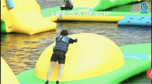 BTS member Jeon Jungkook struggles and falls on a slippery inflatable water obstacle course, exclaiming 'Gravity pulls me down!'.