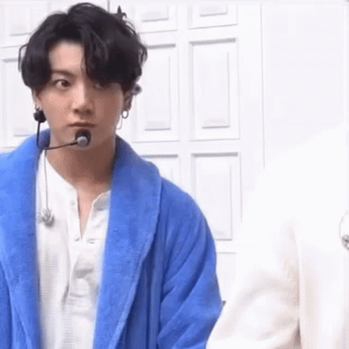 Jungkook from BTS in a blue robe and microphone, giving an intense stare during a reaction moment.