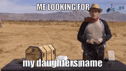 Jerma in a desert, looking for his daughter's name, with a treasure chest nearby and an excavator in the distance.
