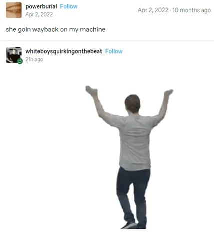 a picture of a man dancing with his arms in the air with the caption she goin wayback on my machine