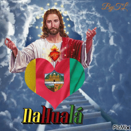 A graphic featuring Jesus with a sacred heart, a heart-shaped flag of Nahualá, and the text 'Nahualá'.