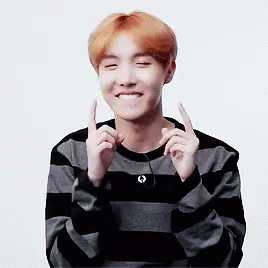 J-Hope from BTS shows his adorable approval with finger hearts and thumbs up, wearing a striped sweater.