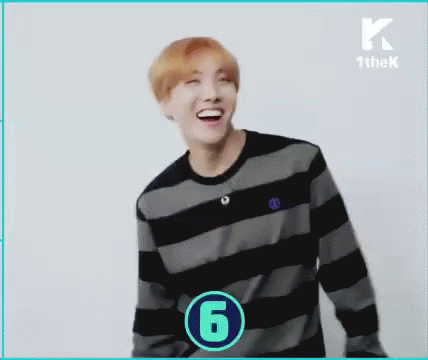 Jhope from BTS is ecstatic, jumping and clapping with joy in a striped shirt.