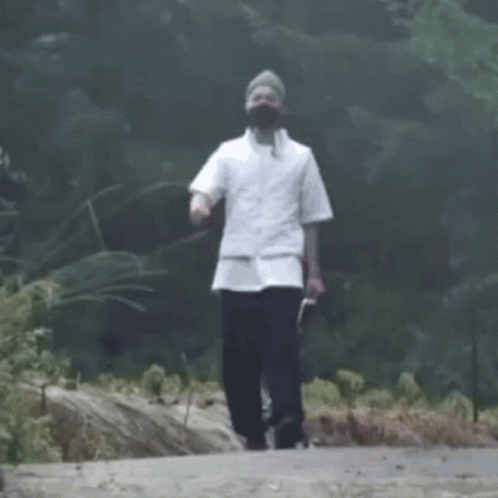 Jhope, also known as Hobi, is seen walking outdoors, wearing a white shirt, black pants, beanie, and face mask.