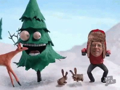 A festive Jibjab animation featuring a dancing figure, a Christmas tree, reindeer, and rabbits in a snowy landscape.