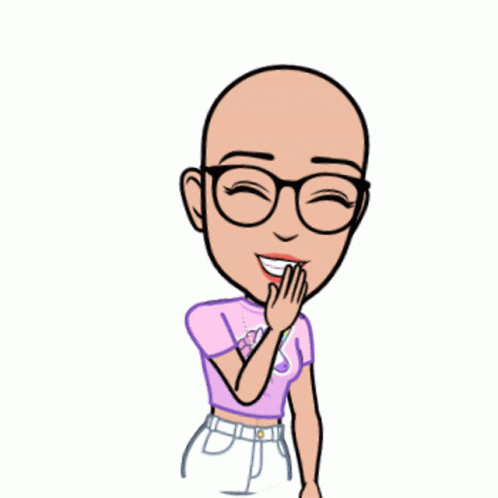 Animated character with glasses and unicorn shirt giggles, covering mouth with hand.