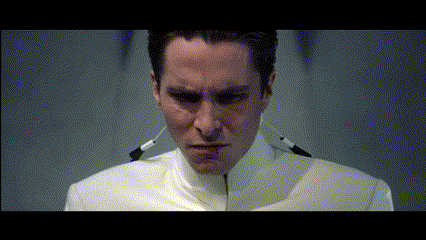 Christian Bale as Jimgito in a tense moment, reacting to a seismograph-like machine with the phrase 'Not without incident'.