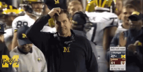 Jim Harbaugh on the Michigan Wolverines sideline during a tense football game against Indiana.