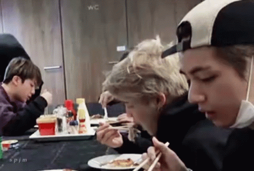 Jimin from BTS is seen enjoying a meal with chopsticks at a table, possibly during lunch with other group members.