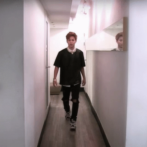 Jimin walks down a hallway, then performs a sudden, surprising dance move.