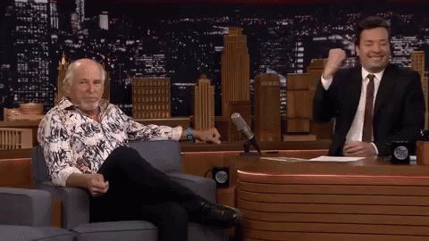 Jimmy Buffett and Jimmy Fallon share a hilarious moment, laughing heartily on a talk show set.