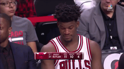 Jimmy Butler on the Chicago Bulls bench, making a dismissive 'psh' gesture, with teammate Dwyane Wade nearby.