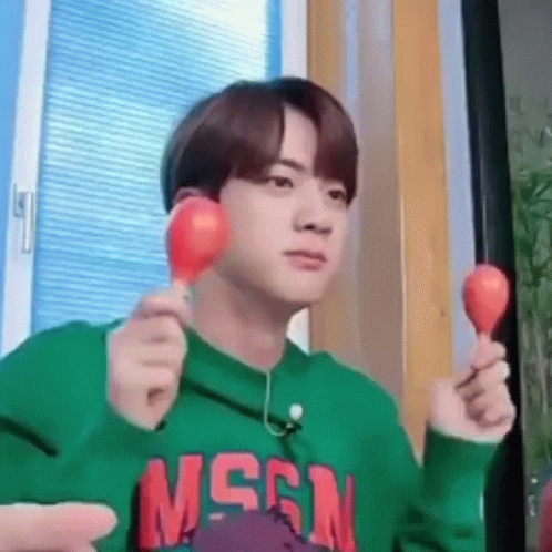 Jin Seokjin, in a green sweatshirt, playfully shakes two red maracas.