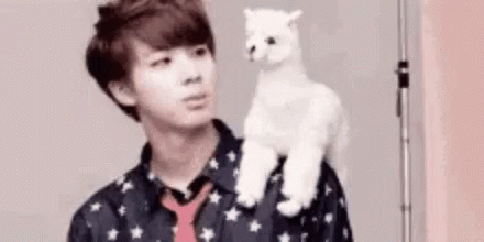 BTS member Jin with a white toy alpaca on his shoulder, which is then quickly removed.