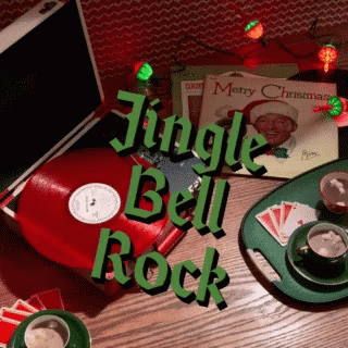 Festive Christmas scene with a red vinyl record, 'Merry Christmas' book, twinkling lights, and hot cocoa.