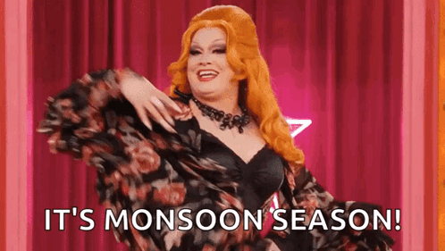 Jinkx Monsoon joyfully declares 'It's Monsoon Season!' while dancing on stage, showcasing her iconic drag queen charisma.