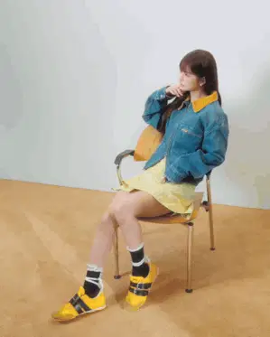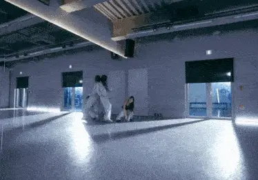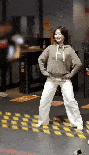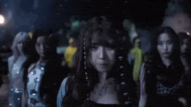 Jinni from Nmixx with long pink hair poses playfully, making peace signs and cat gestures.