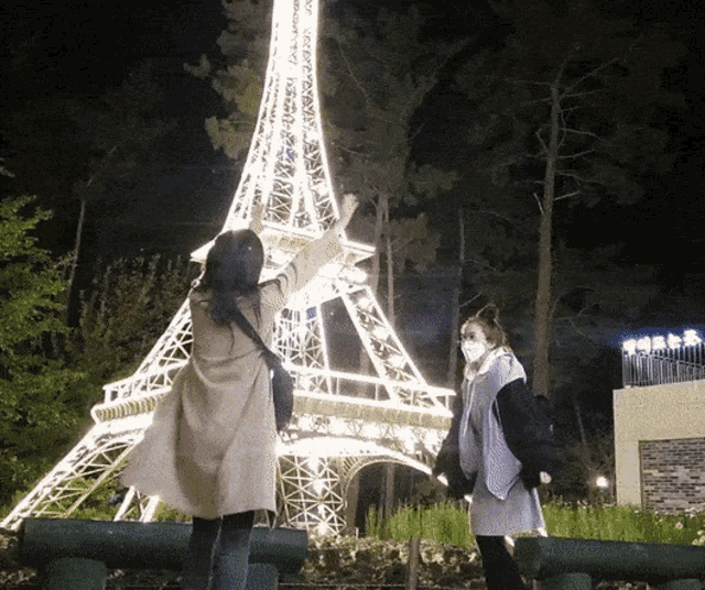 Jinny Jinnytty and Tyongeee pose in front of the illuminated Eiffel Tower replica in Jeju, making a heart shape.