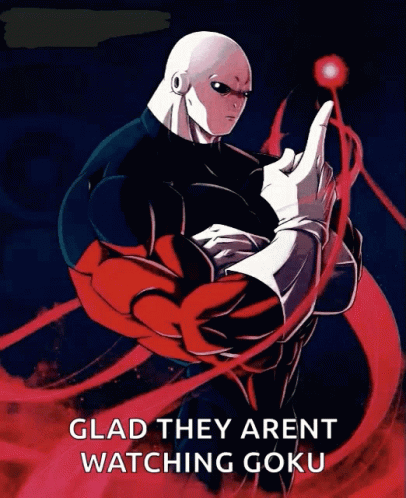 Jiren, a powerful Dragon Ball character, is shown with the caption 'Glad they aren't watching Goku.'