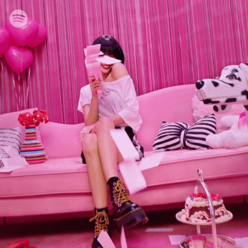 Jisoo of BLACKPINK sitting on a pink couch, surrounded by pink decor, holding paper for Spotify.