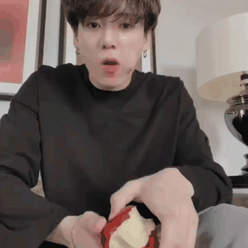 Jungkook, also known as Jk, eating an apple while sitting indoors and looking at the camera.