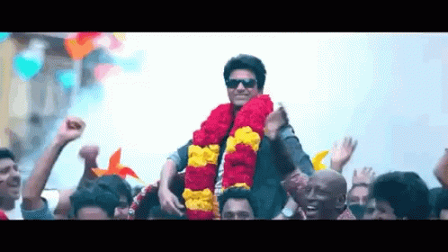 Siva Karthikeyan, wearing sunglasses and a garland, is carried by a cheering crowd amidst confetti.